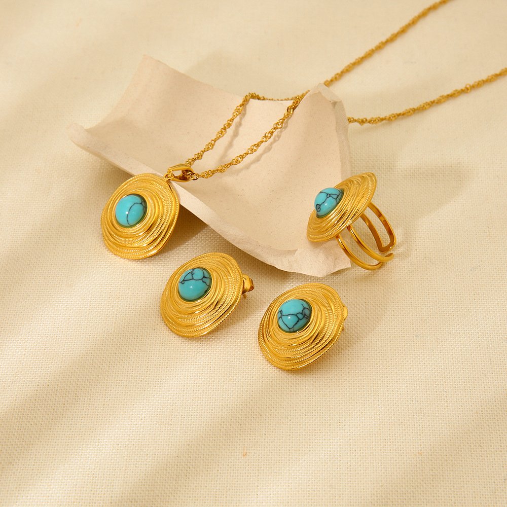 Blue Turquoise Earring Stud Ring Necklace Set