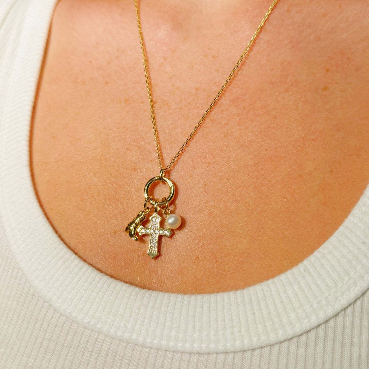 Cross Denim Pearl Heart Pendant